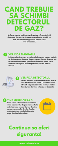 Pentru a putea sti cu siguranta care este durata de viata a fiecarui detector Primatech, trebuie sa se consulte manualul de utilizare a fiecarui detector instalat. Respectand aceasta perioada de inlocuire a aparatului de la momentul instalarii, oricine va putea ramane in siguranta constant.