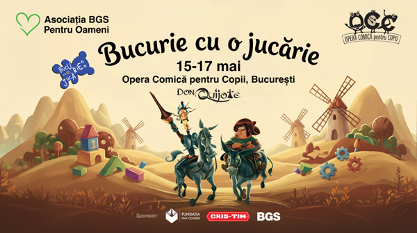 De Ziua Internationala a Copilului, Asociatia BGS „Pentru Oameni” revine cu cea de-a 13-a editie a campaniei „Bucurie cu o Jucarie”, realizata impreuna cu Opera Comica pentru Copii. Evenimentul va avea loc in perioada 15-17 mai 2026, in cadrul spectacolelor pentru copii „Don Quijote”, programate in patru reprezentatii: vineri, de la ora 18:30, sambata, de la orele 11:00 si 17:00, si duminica, de la ora 11:00. Biletele pot fi achizitionate de pe site-ul oficial al institutiei.