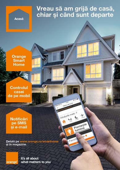 Orange are de astazi in magazine solutia Orange Smart Home, dupa o perioada in care produsul a fost testat cu utilizatorii. Bazata pe principiul unei instalari usoare, solutia include un sistem de senzori wireless gestionati printr-o aplicatie dedicata ce poate fi accesata de pe telefon, tableta sau laptop. Pachetul propus include doi senzori la alegere, un dispozitiv central la care acestia sunt conectati, un SIM de date mobile, notificari nelimitate pe e-mail si SMS si acces la aplicatia Orange Smart Home ce permite monitorizarea si controlul casei. Pachetul poate fi achizitionat printr-un abonament lunar de 15 euro, pe o perioada de doi ani.