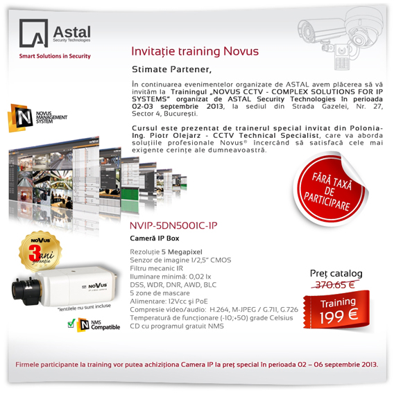 In continuarea evenimentelor anterioare organizate de ASTAL Security Technologies si devenite deja un puct de interes pentru piata de sisteme de securitate, avem placerea sa va invitam la Trainingul “NOVUS CCTV – COMPLEX SOLUTIONS FOR IP SYSTEMS” in perioada 02-03 septemebrie, la sediul din Strada Gazelei, nr. 27, sector 4, Bucuresti.