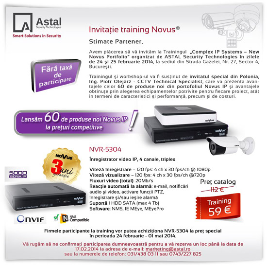 Cele mai noi produse din portofoliul Novus IP prezentate intr-un Training gratuit in perioada 24-25 februarie 2014, organizat de ASTAL Security Technologies la sediul din Strada Gazelei Nr. 27, Sector 4, Bucuresti.