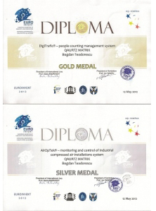 Compania Quartz Matrix a primit, din partea organizatorilor expozitiei EUROINVENT, medalia de aur pentru solutia de management a fluxului de persoane DigiTrafic® si pe cea de argint pentru sistemul de monitorizare si control al instalatiilor cu aer comprimat AirOpTek®.